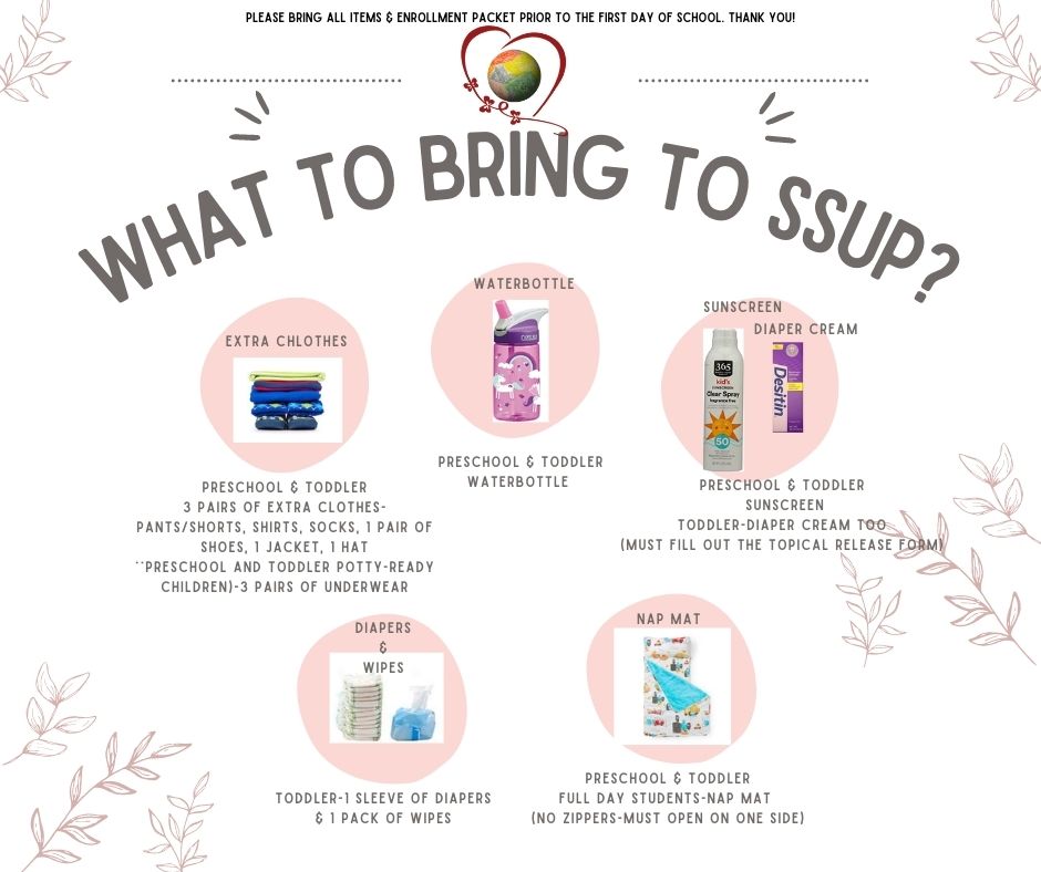 Step 3. If application is approved, you will receive confirmation from the Director Mrs. Bixler and a student/ parent and Teacher interview will be scheduled to allow the opportunity for the child and teacher to get acquainted with each other and for parents to communicate any questions or provide information about their child that will allow the teacher to better facilitate his/her needs. Enrollment packet will also need to be complete. All forms are listed here. Please request a copy of the child's immunization record from their physician to include in their file along with the physician report that will need to be filled out by their doctor. ALL information will need to be completed BEFORE the child can start at SSUP.